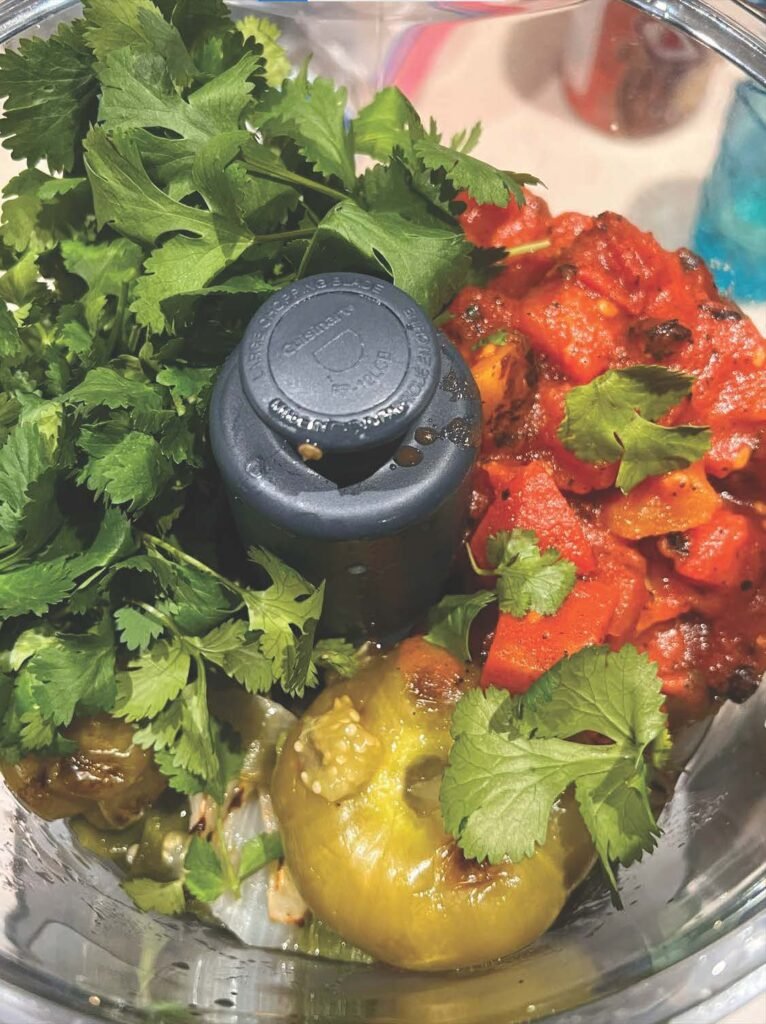 - Combine all roasted veggies, roasted tomato can, and cilantro in food processor or blender