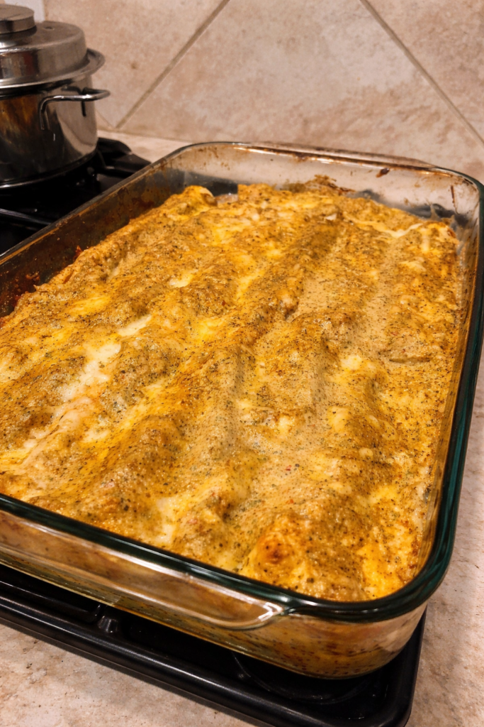 - Bake in oven at 350°F for 20 mins, halfway through baking, add remaining sauce to enchiladas
